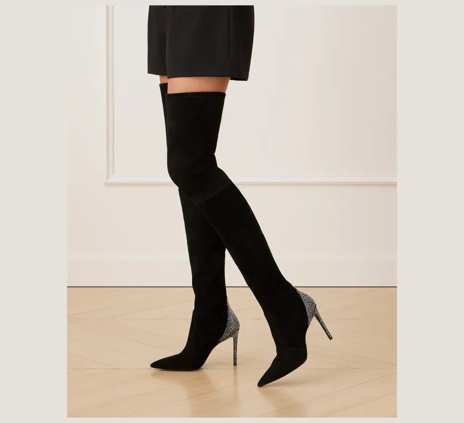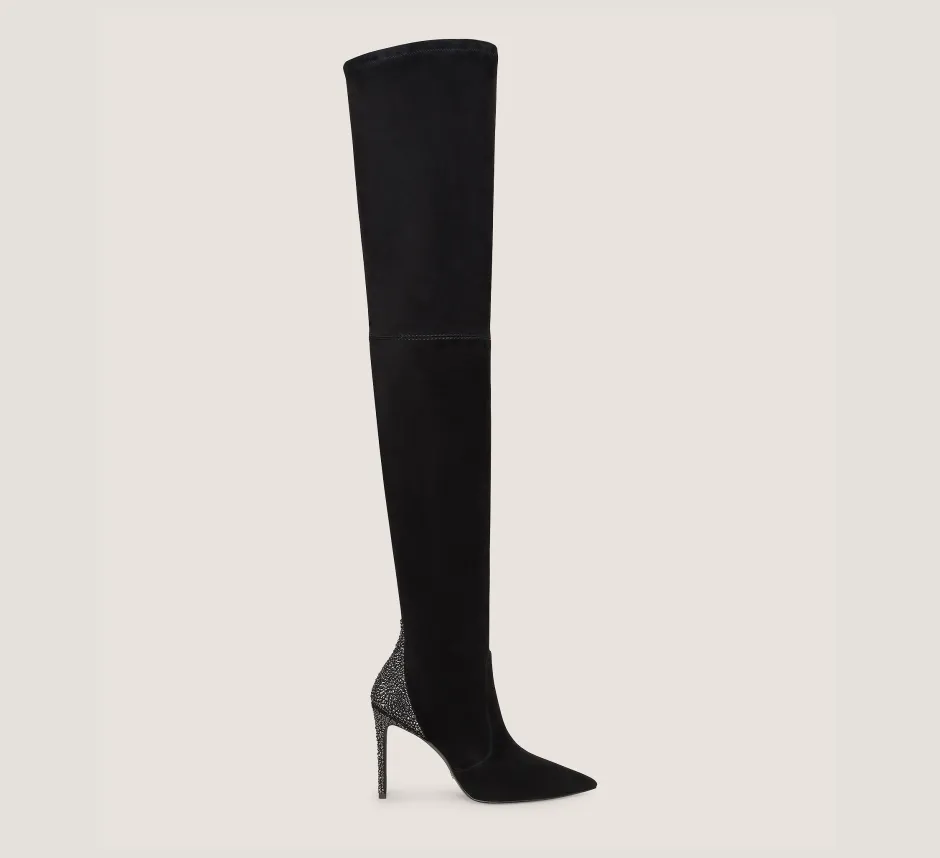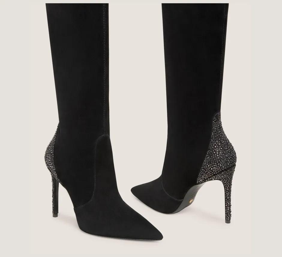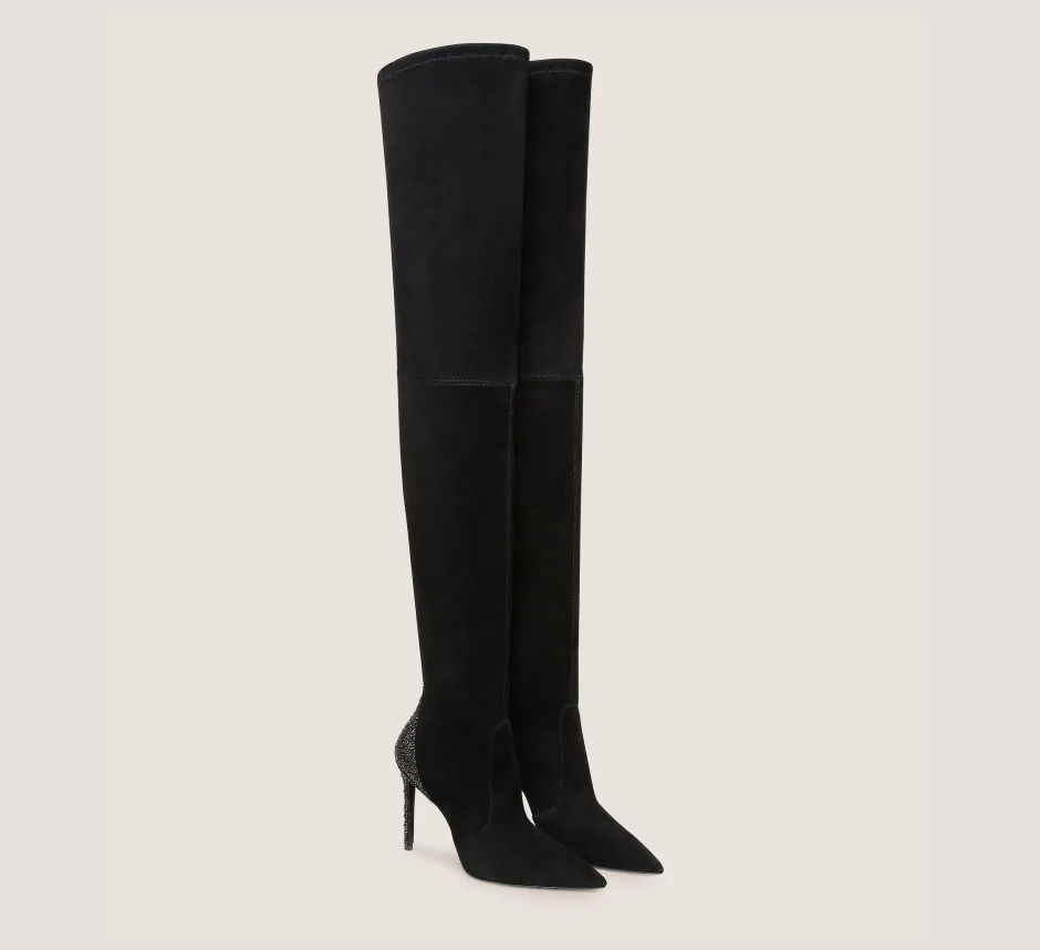 The thigh-high ULTRASTUART ROYALE 100 BOOT embodies high-octane glamour. It features luxe, hand-placed crystal embellishments precisely set on the back counter and stiletto heel and is designed to turn heads. Crafted by our artisans in Spain from innovative stretch-infused suede, it is engineered to mold to your leg for a flattering, elongating effect. Reach for it to elevate any special occasion look.