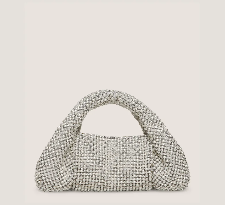 The MODA CRYSTAL PEARL MINI TOTE is unequivocally glamorous. Crafted by SW artisans in Italy from a luxe crystal- and pearl-embellished mesh material, this striking mini bag stands to add a touch of shine to any occasion look. A softly structured silhouette further sets it apart. Go hands-free with this statement style — it features a detachable chain strap that enables it to be worn on the shoulder, if you choose.