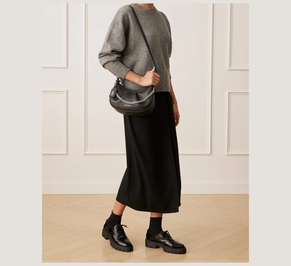 The STELLAR CRESCENT BAG features luxurious details that truly set it apart. Crafted by our artisans in Italy, it is defined by a curved crescent silhouette and a softly gathered design that gives it its distinct shape. It is finished with a detachable chain strap along with a sleek shoulder strap that can be adjusted to your ideal drop.