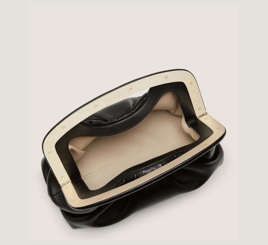 The MODA FRAME POUCH features an artful gathered design that showcases the expert craftsmanship of our artisans in Italy. It fastens at the top with a structured magnetic frame and opens to reveal a surprisingly spacious interior. Carry it via its top handle, as a clutch or a shoulder bag — there’s no wrong way to style this look.