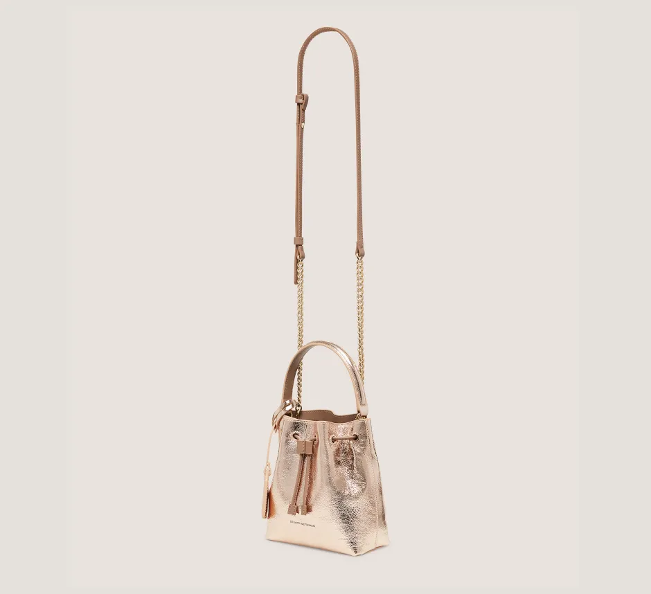 The RAE MINI BUCKET BAG delivers on-the-go glamour with elevated details that meld fashion and function. Crafted by our artisans in Italy, this compact design features a drawstring closure and is sized to fit your everyday essentials. Wear it in the nook of your arm or as a shoulder bag: It features a detachable top handle and an adjustable shoulder strap with chain accents that can easily be removed depending on your outfit.